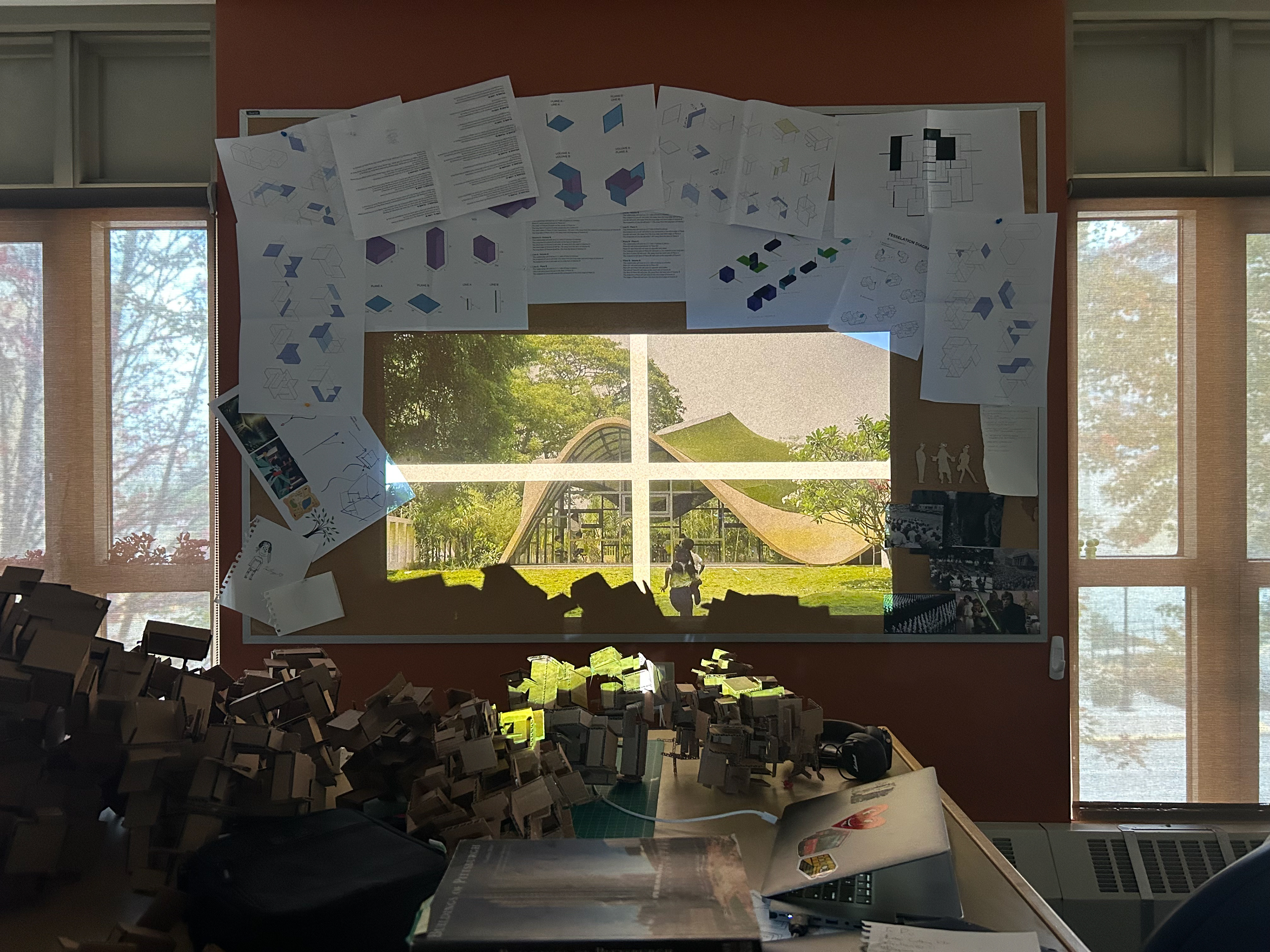 Perhaps the clearest way students adapt their studio space according to their desires is the pin-up board. The projected film is edited from archival footage, a process that exemplifies its own form of reuse and adaptation, and its final product represents the complex emotions and inspirations of myself as an architecture student. While most of the space was left candid, the drawings and models on the pin-up board and desks were rearranged to frame the video.