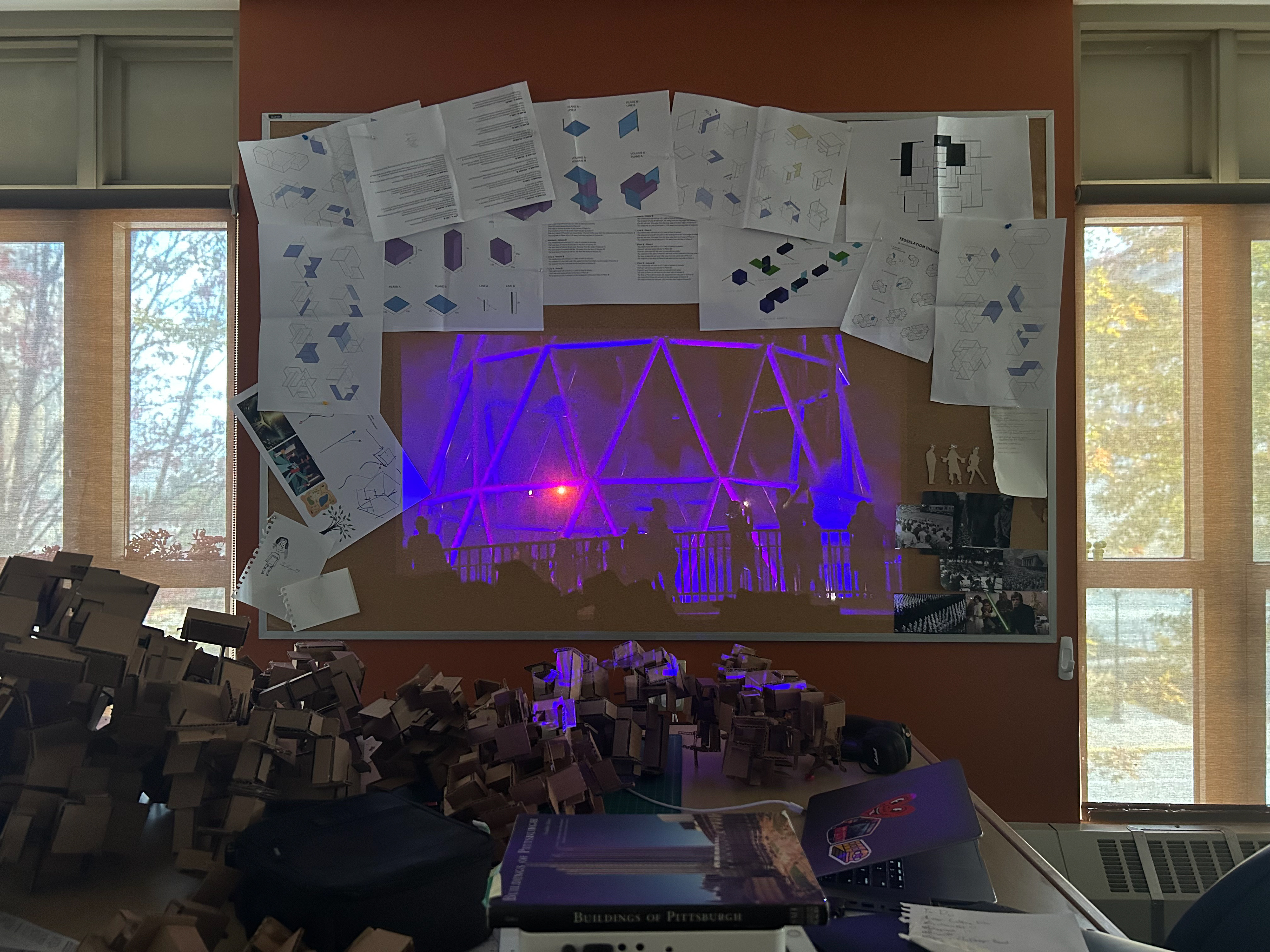 The studio is the core of what is to be an architecture student. This is a space that we paradoxically exist in physically while we are imagining and futuring new spaces intellectually. This installation explores how it is that students adapt their existing studio space and create their own micro-architectures while creating their work.